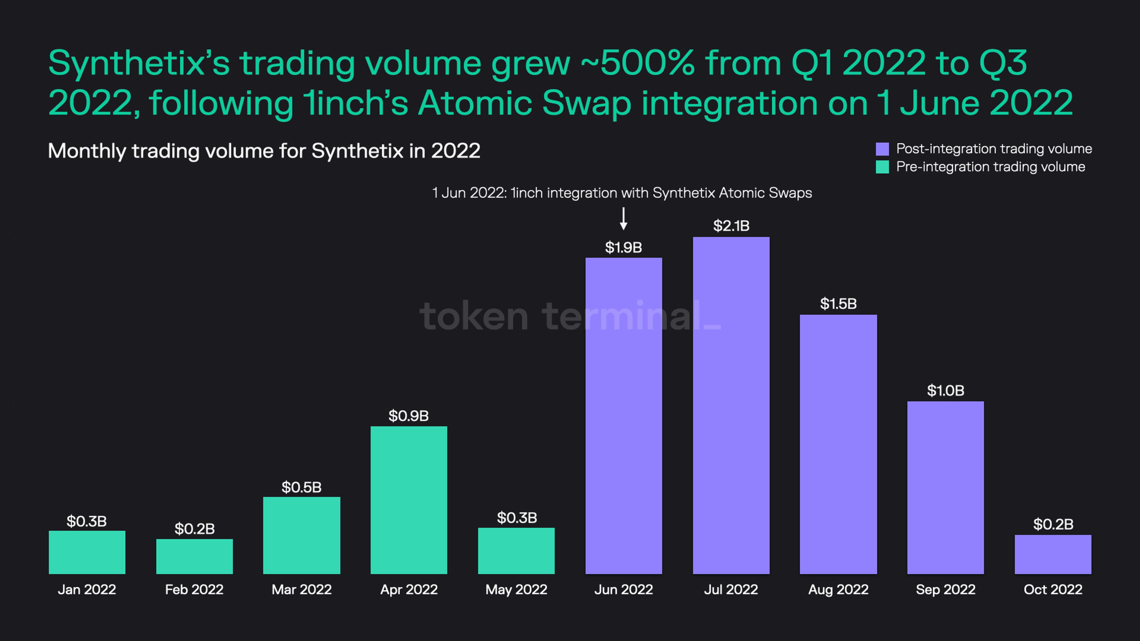 - The monthly trading volume on Synthetix grew from $0.3B to $1.9B following the integration of Synthetix’s atomic swaps with DEX aggregator 1inch on 1 June 2022.