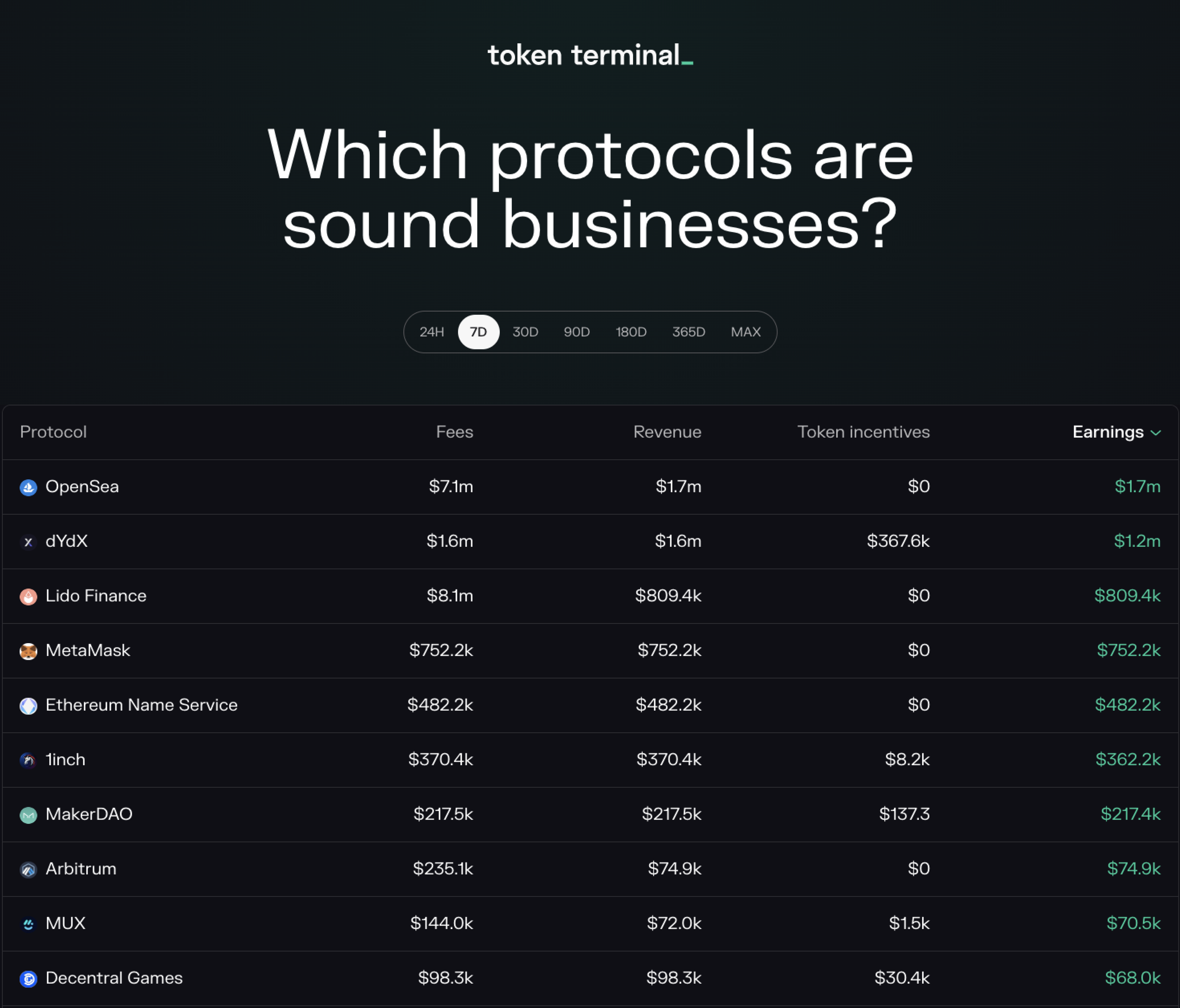 Earnings = revenue - token incentives.If this number is negative, a project spends more on token issuance than it earns in revenue.