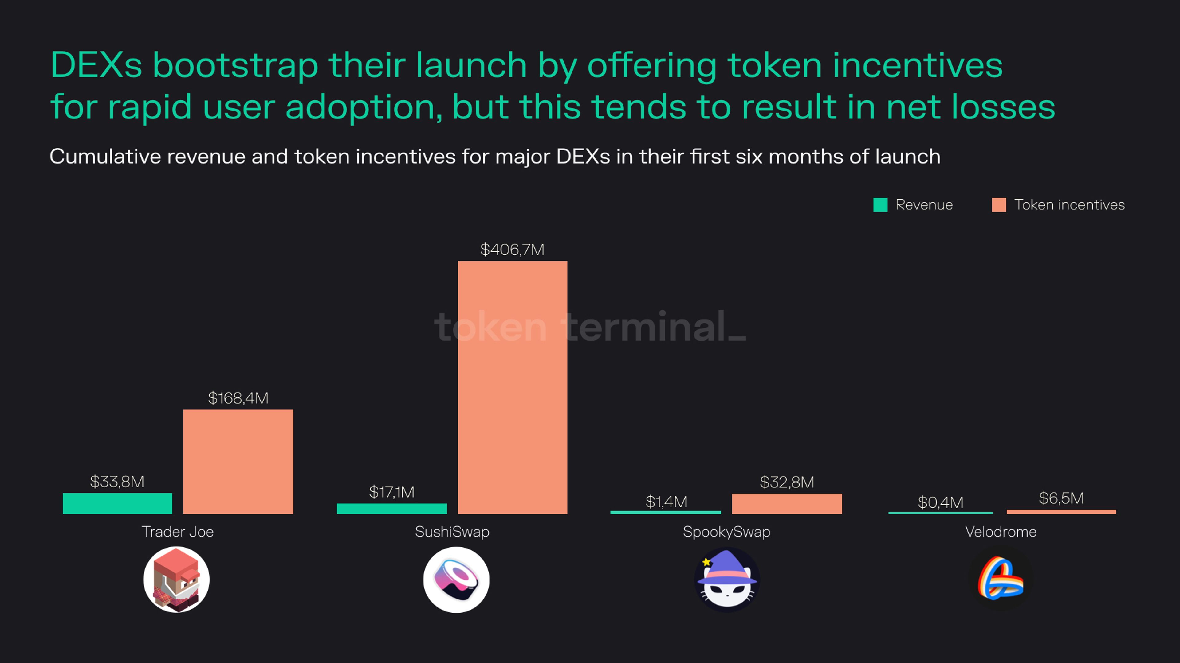 - The most prominent example of a DEX using token incentives to bootstrap growth is SushiSwap and its “vampire attack” on main competitor Uniswap.