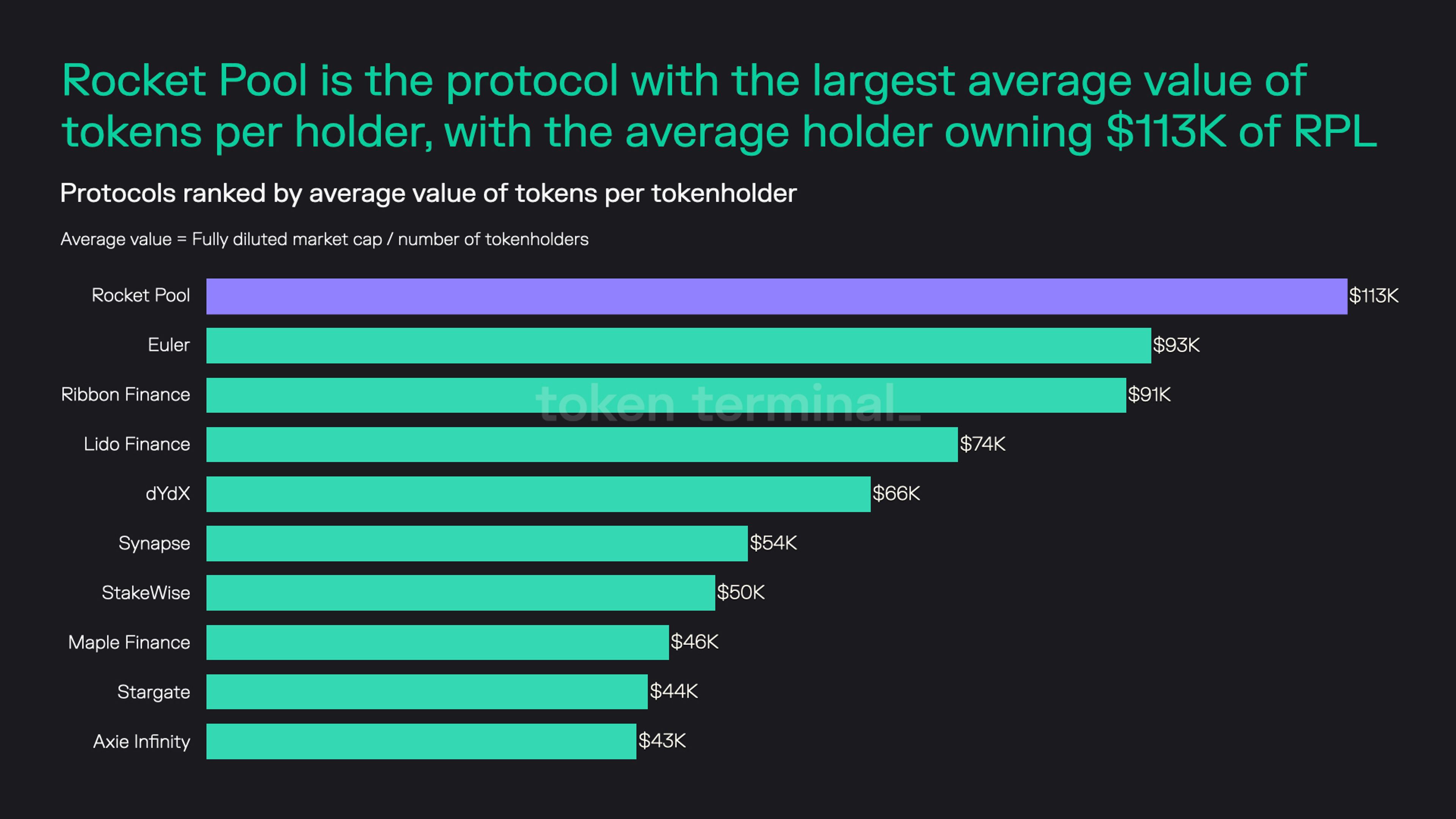 - The protocols with the largest average value of tokens per tokenholders are Rocket Pool, Euler and Ribbon Finance, with $113K, $93K and $91K per tokenholder, respectively.